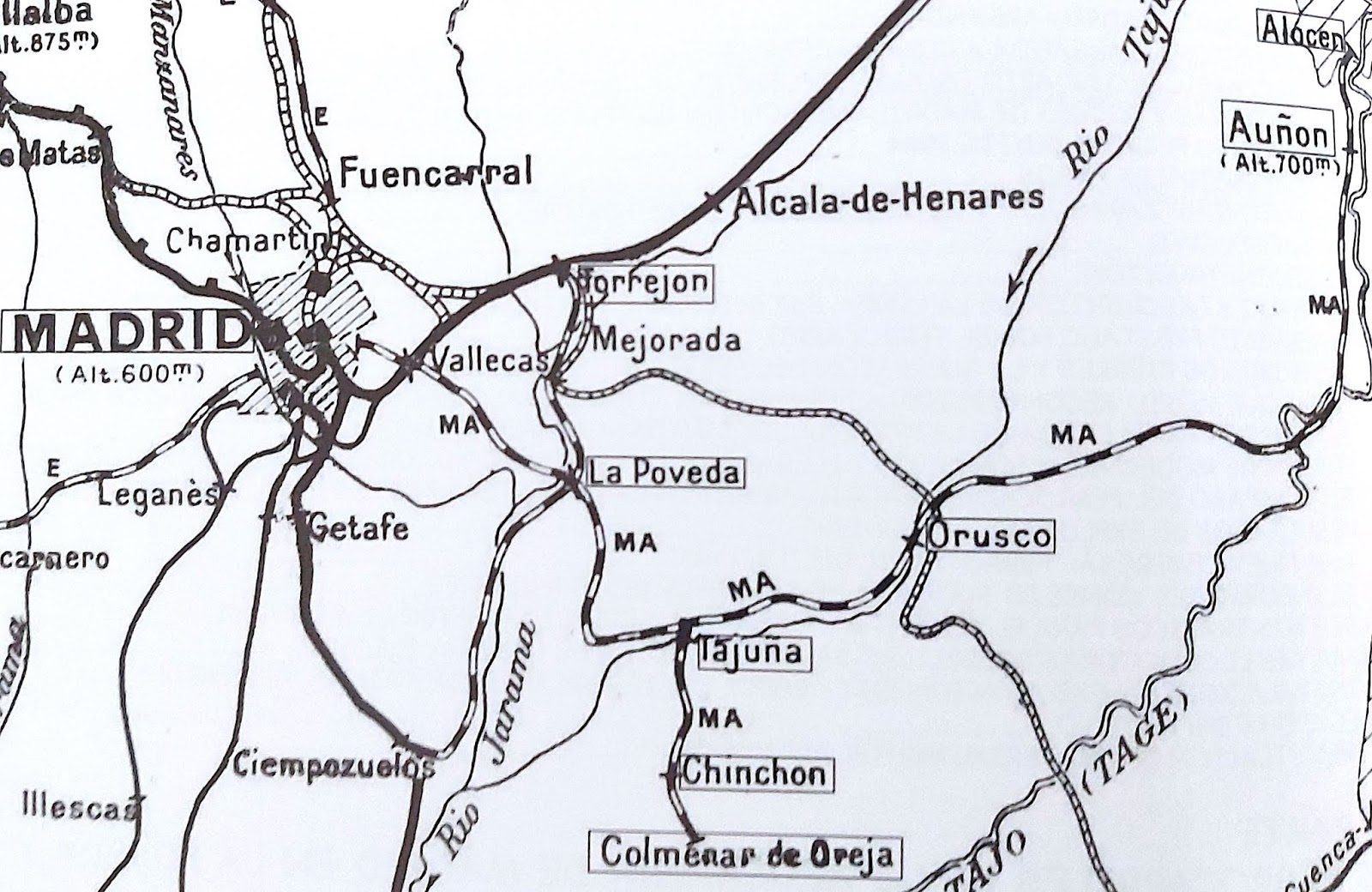 Recorrido completo entre Madrid y Alocén pasando por La Poveda, Tajuña, Orusco y Auñón (Del libro "Geografía de los Ferrocarriles Españoles" de Lartilleux)