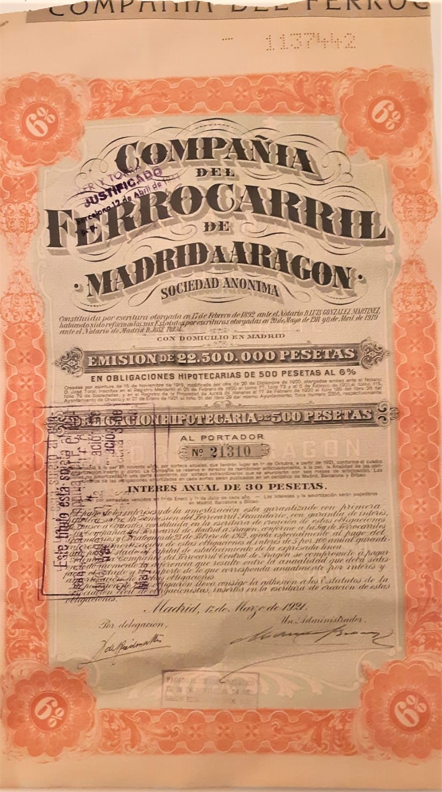 Obligación hipotecaria de la Compañía del Ferrocarril de Madrid a Aragón emitida en 1921 (cortesía Ignacio Sanz)