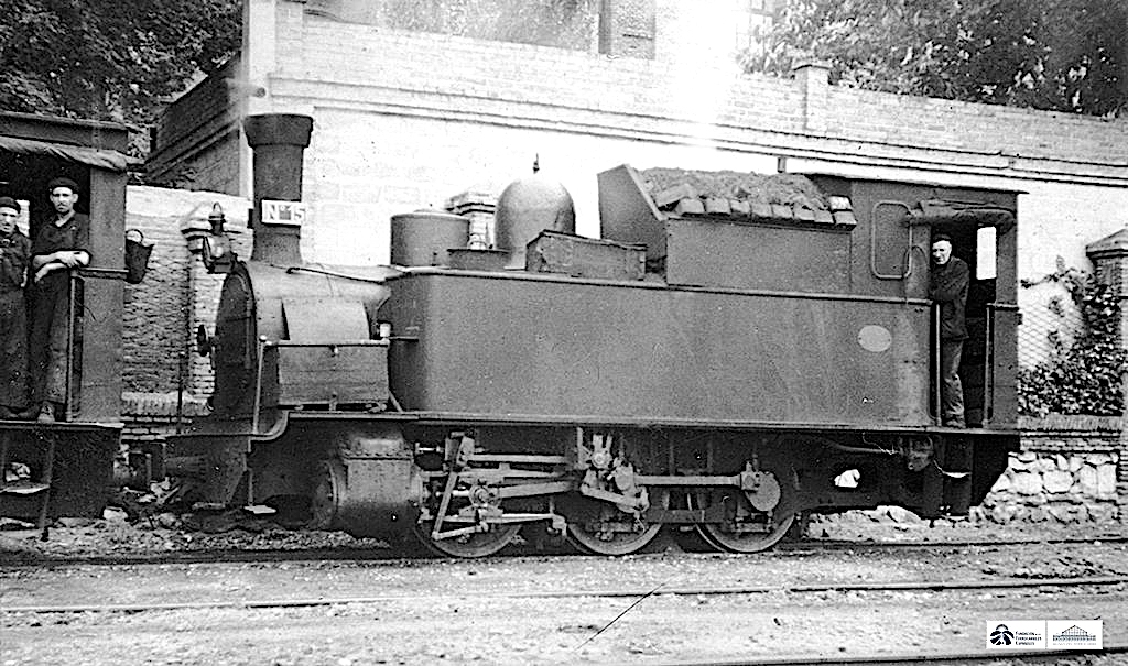 | Probablemente una de las locomotoras de la serie 9, 10 u 11 en cabeza de un tren del que sólo se ve el furgón. La imagen, tomada en 1902, recuerda perfectamente la popular frase "El tren de Arganda, que pita más que anda" refiriéndose a su proverbial lentitud (autor desconocido/Archivo Municipal de Arganda del Rey) |