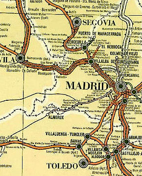 | Un mapa de la línea, algo más claro. Pertenece a la Memoria de 1943 de la Explotación de Ferrocarriles por el Estado (EFE) y está tomado del libro del Ferrocarril Madrid-Almorox de Gustavo Vieites. |
