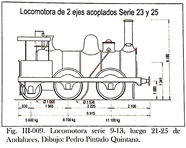 | La foto anterior coincide perfectamente con el dibujo siguiente realizado a partir del álbum que publicó Andaluces en 1928 y que figura en el libro "Locomotoras de Andaluces" de Fernando Fernández Sanz. Como se ve, en esa fecha ya solo quedaban operativas las 23 y 25. |