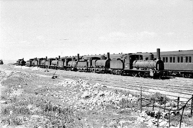 | En marzo de 1958 Karl Wyrsch fotografió en la zona de Santa Catalina, cercana al depósito madrileño de Cerro Negro esta larga fila de locomotoras que esperaban el desguace. En primer término aparece una de las locomotoras de esta serie (AHF/MFM) |