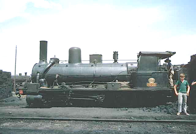 | La 040-2051, "Pennarroya" (sic) también en Villanueva del Río y Minas en 1966. Como la anterior debió ser desguazada, o al menos apartada, ese mismo año (Foto: J. Jarvis)
