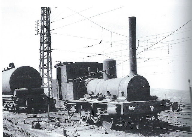 Pero dos años más tarde, en 1965, fue fotografiada por Marshall en la estación de Segovia. Estaba ya desprovista de su tanque en albarda, tenía un domo distinto y aparecía ya con esa increíble chimenea. Al parecer actuaba como caldera fija utilizada para calentar el fueloil para otras locomotoras y supongo que la desmesurada chimenea tenía como objeto que el humo afectara lo menos posible a los cables de la electrificación.