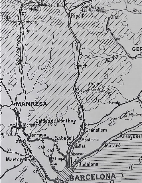 Mapa de la línea desde San Juan de las Abadesas a Barcelona pasando por Ripoll, Vic y Granollers (tomado de la "Geografía de los Ferrocarriles Españoles" de H. Lartilleux)