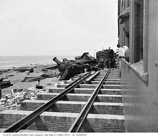 De nuevo la MZA 566, ahora descarrilada en Bogatell hacia 1910 (Mas/Institut Amatller d´Art Hispanic/cortesía J.A. Méndez Marcos)