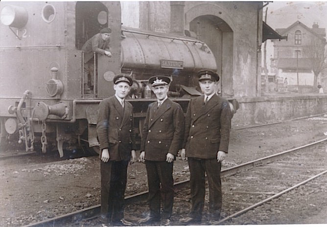 | Responsables del ferrocarril (supongo) se retratan junto a la nº 12 "Santurce". ¿Qué estaría pensando el maquinista? (fondo Rodríguez Camarero) |