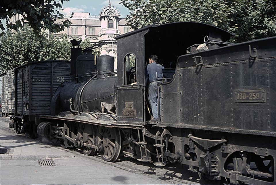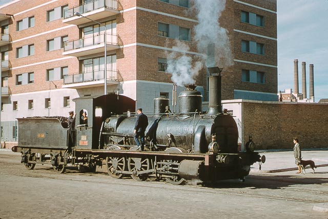 | La 030-2605 en la zona portuaria de Barcelona en 1963. Dado que la locomotora está parada, parece que la señora y el perro andan muy entretenidos con nuestra máquina (J. Jarvis) |