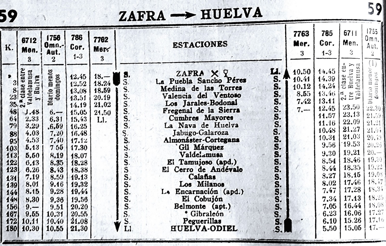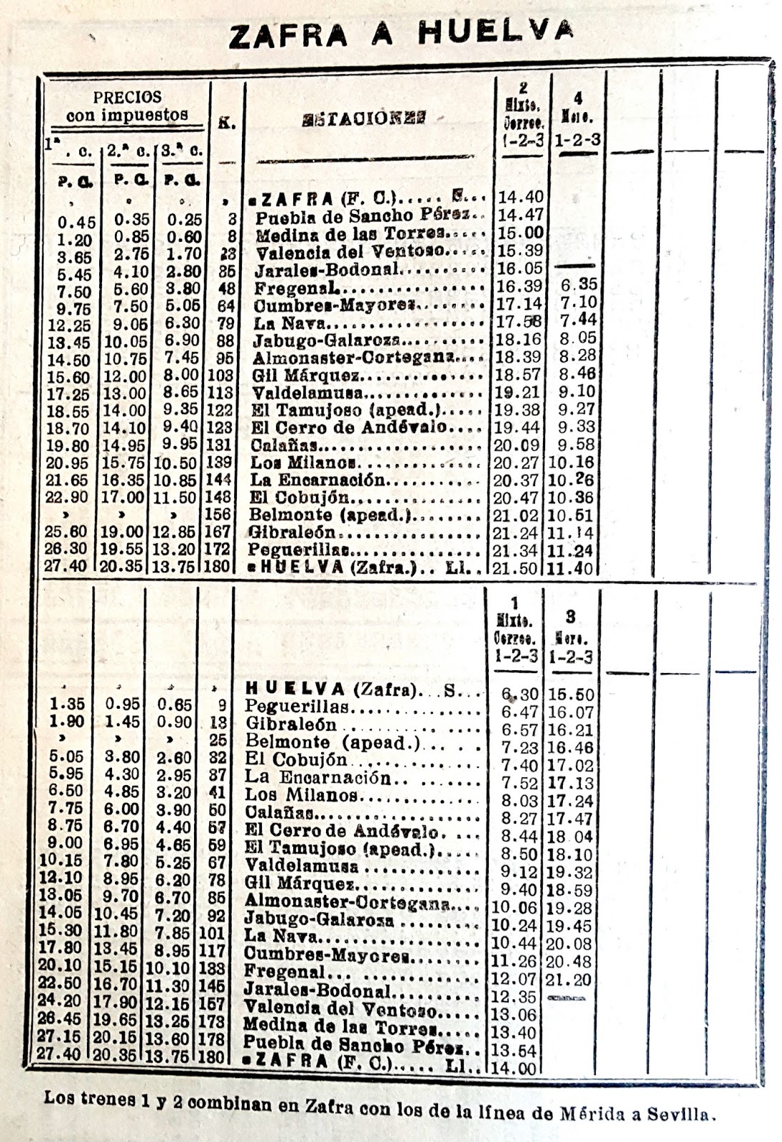La línea de Zafra a Huelva fue construida con capital inglés a partir de 1881 e inaugurada en 1887. La compañía pensaba en el negocio que podía obtener mediante el transporte de productos agrícolas del sur de Badajoz y, sobre todo, del de las minas de la vertiente sur de Sierra Morena, en el norte de la provincia de Huelva, sin dejar de lado la producción ganadera y forestal de esta misma zona. En cualquier caso, hay también quien opina que la motivación real de aquellos empresarios ingleses era la realización de túneles y trincheras para la prospección de una zona tan rica en minerales. De una forma u otra, el estudio y concesión de esta línea dio lugar a interesantes polémicas, relacionadas con la existencia de otros ferrocarriles mineros de la zona y la mayor o menor idoneidad de las rutas propuestas.