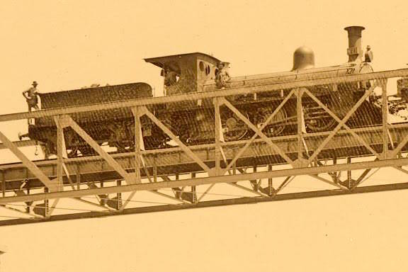 | La 17 y luego 23, casi recién estrenada, haciendo pruebas sobre el puente Sillo en 1886 (autor desconocido/ a través del Ferrocarril en Andalucía. Cortesía de J. A. Méndez Marcos) |