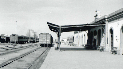 | La estación de Huelva-Odiel en 1956, cuando todavía la 120-2093 estaba por allí (Juan B. Cabrera) |
