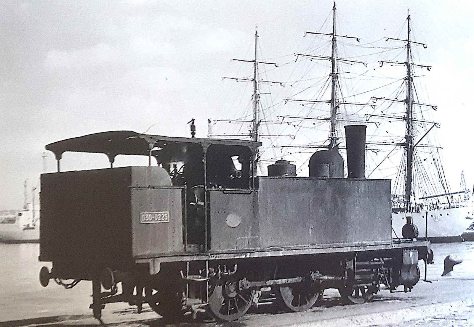 | En octubre de 1963, Marshall obtuvo esta excelente imagen de la 030-0225 en el puerto de Cádiz con el fondo del velero francés "Liberté". |