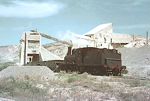 | La 2475 todavía trabajando en Estivella, cerca de Sagunto, con un corte de tolvas en 1966, año de su desguace, o al menos de su baja (Tony Bowles) |
