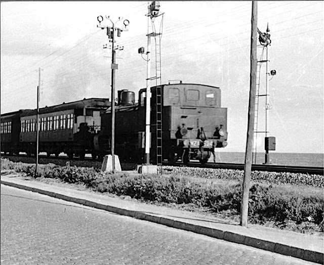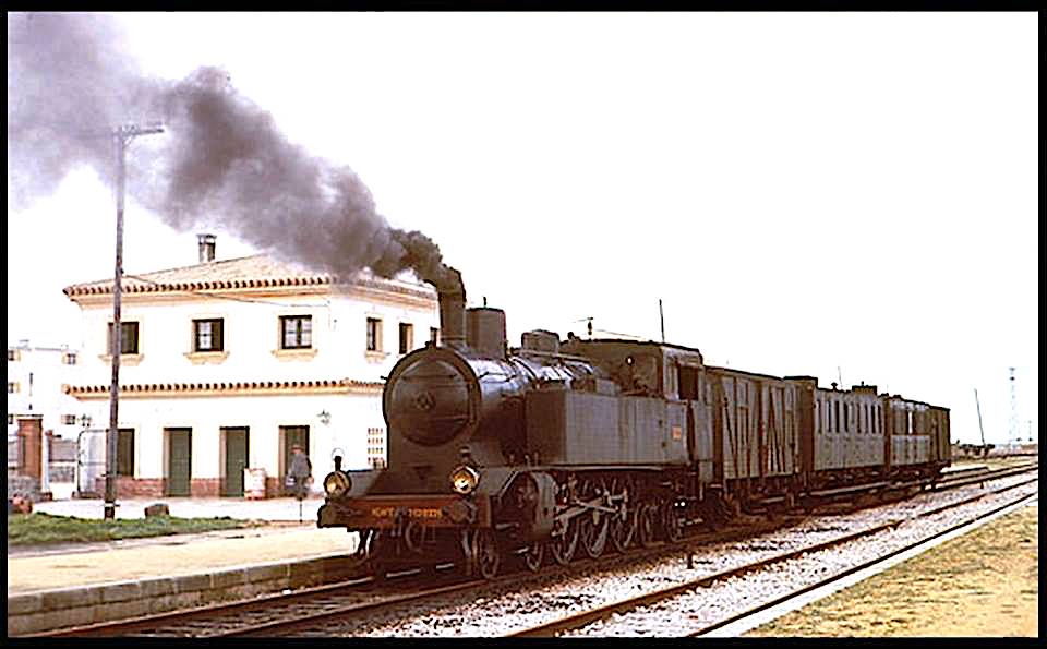 | La misma locomotora en la estación de Rota en cabeza del "Tren de la Costa" (autor desconocido/cortesía César Larriba Arboe) |