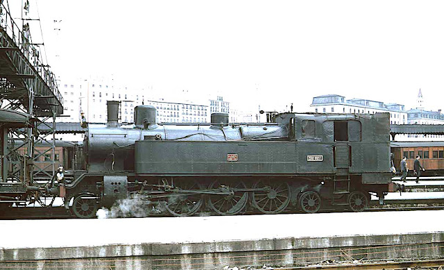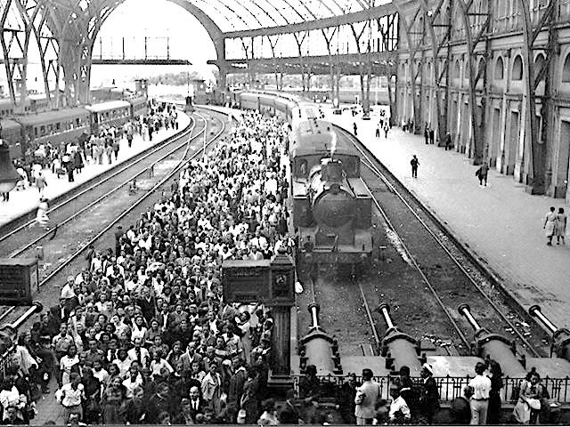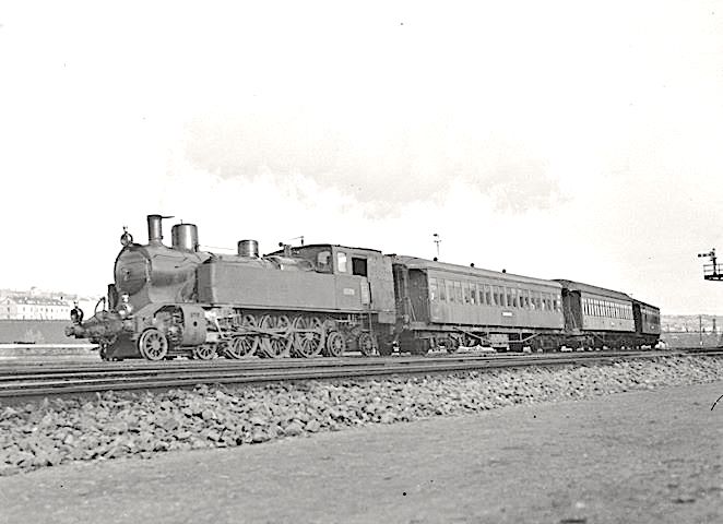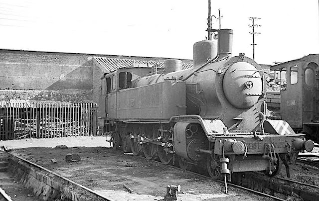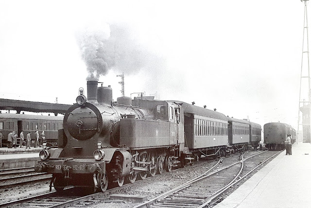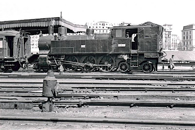 | La MZA 622 (en RENFE 232-0203) recién llegada a la estación de Francia en Barcelona con un tren de cercanías probablemente en los años cuarenta (autor desconocido/cortesía J. A. Méndez Marcos) |