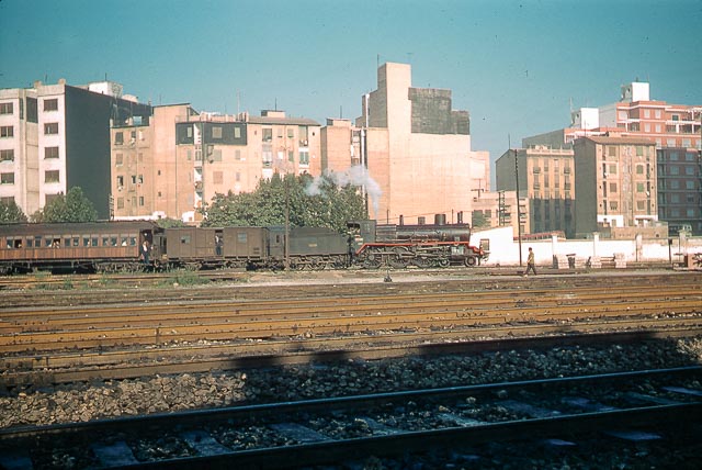 | Valencia, estación del Norte. Una locomotora de esta serie conduce una composición de coches de dos pisos en algún servicio de cercanías en mayo de 1961. La imagen es todo un museo vivo: al fondo a la izquierda un automotor Maybach y en la vía anterior una 1800 desplazada seguramente desde su zona habitual para colaborar en la tracción de trenes naranjeros, y tras ella un automotor Ganz pequeño (AHF/MFM. Autor Karl Wyrsch) |