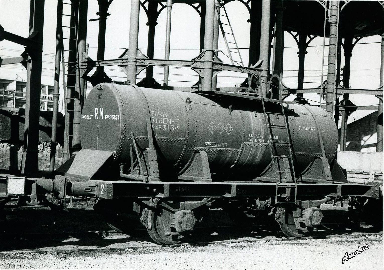 | Al menos algunos de los vagones cisterna de las Du Bousquet las sobrevivieron. Aquí aparece uno de ellos fotografiado en Córdoba en los años setenta (Amoluc/cortesía J. A. Méndez Marcos) |