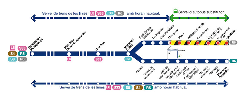 FGC pone a disposición de los usuarios un servicio de autobuses que realizará paradas en todas las estaciones intermedias de la línea afectada. El servicio entre las estaciones de Plaza España y Masquefa funcionará con normalidad y mantendrá los horarios habituales del fin de semana. Del mismo modo, el resto de líneas del Metro del Bajo Llobregat no se verá afectado por estos trabajos de mejora.