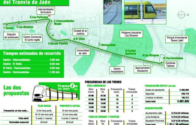 Las cuentas son sencillas. Para que el déficit del sistema tranviario de Jaén se reduzca, también tiene que estar menos en la calle, de esta forma, al menos, se garantiza que salga de las cocheras después de seis años. La propuesta que pone encima de la mesa la Consejería de Fomento y Vivienda —que invirtió 120 millones de euros en construir la infraestructura necesaria y adquirir los elementos móviles del sistema tranviario, para que el Ayuntamiento se los pagará poco a poco— pasa por el compromiso de colaborar en su explotación, al aportar el 40% del déficit, y replantear su uso. La propuesta es poner en servicio, como máximo, cuatro convoyes para que la frecuencia de paso por parada sea de 10 minutos en hora punta y 15 minutos en hora valle. Es preciso, como se deja claro establecer una coordinación intermodal con la red de autobuses urbanos para evitar que se solapen y, al contrario, se retroalimenten. Esta necesidad ya fue admitida por el alcalde, Javier Márquez, cuando la semana pasada hizo público que el Ayuntamiento ve con buenos ojos esta propuesta, y dejó claro que se trabajará en este sentido. El presupuesto con el que se trabaja, conforme a la aplicación de un plan de movilidad urbana sostenible oscila entre los 1,2 y los 1,8 millones de viajeros al año, con lo que los cálculos se hacen sobre una cifra de 1,5 millones. Si se multiplica por los 0,82 euros obtenidos por la venta de cada uno de los billetes, es el resultado es, como máximo de 1,6 millones de euros. Los costes de explotación estimados son de 2,8 millones, por lo que deduciendo los ingresos de los costes anuales de la operación, el déficit de explotación del sistema tranviario de Jaén, oscilaría entre 1,87 y 1,3 millones año. Esto da lugar a un reparto de los números rojos de entre 750.000 y 520.000 euros por parte de la Junta, es decir, un 40%; otro tanto el Ayuntamiento y el 20% restante, entre 370.000 y 260.000, por parte de la Diputación. Esta última aportación, como explicó el presidente de la Administración provincial, Francisco Reyes, sería en forma de patrocinio del tren ligero con la marca “Jaén, paraíso interior”. El consejero de Fomento, Felipe López, reforzó esta idea, al dejar claro que la Diputación, sin competencias en materia de transporte público, no puede subvencionar el tranvía. El Gobierno local, no obstante, dudo de esta fórmula, al entender que, de esta forma, se limita la posibilidad de anunciarse a las empresas que sí estén interesadas en utilizar el sistema tranviario como soporte. Eso sí, el máximo responsable municipal jiennense, se mostró abierto a buscar soluciones.