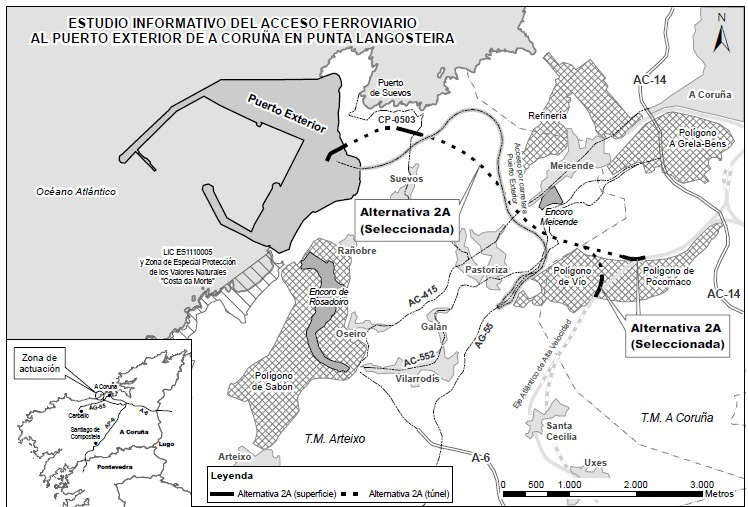 Dicha alternativa se inicia en la zona norte del recinto portuario y conecta con el Eje Atlántico de alta velocidad en el entorno del polígono de Vío, con ramales a La Coruña y Santiago. La conexión se diseña para el tráfico de trenes de mercancías generados por el puerto exterior, que circularán a una velocidad máxima de 100 km/h, en vía única y ancho ibérico, electrificada a 3 kilovoltios. Considerando el tronco principal puerto-La Coruña y la conexión Puerto-Santiago, tiene una longitud total de 6,55 kilómetros de los cuales 4,52 son en túnel. El coste estimado de la actuación en el estudio informativo es de 132 millones de euros.