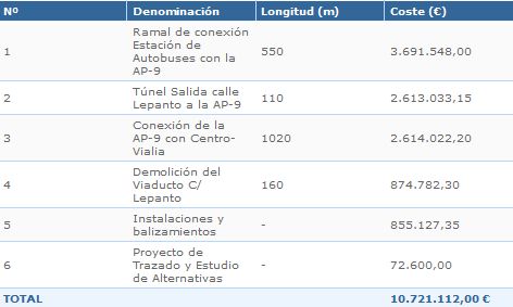 El importe global de la actuación asciende a 10.721.112 euros, de los cuales Adif Alta Velocidad aportará 6.699.392,62 –el 62,49 por ciento del total–, la Xunta de Galicia, 1.698.979,18 euros. (15,85 por ciento) y el Ayuntamiento de Vigo 2.322.740,20 euros, el 21,67 por ciento.