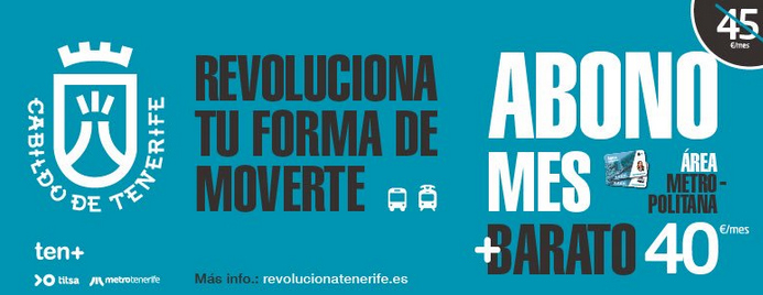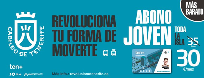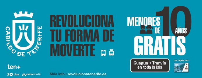 (10/09/2018) Las primeras medidas que se han aplicado en el transporte público de la isla –tranvía y autobuses– dentro de la campaña “Revoluciona tu forma de moverte” consisten en la reducción del precio del Abono Joven —que ha pasado de 35 a treinta euros al mes— y del Abono Mes Metropolitano —cuyo coste se ha reducido de 45 a cuarenta euros—, y en la creación de la Tarjeta Ten+ Infantil, la cual amplía de los cinco hasta los diez años la gratuidad del uso del transporte para los niños.