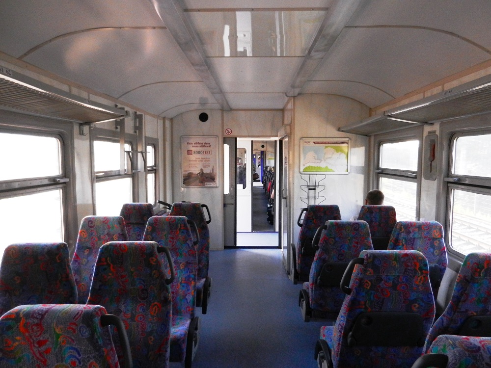 Generosa distribución de espacios en un tren regional de Letonia con un vestíbulo ampliado dentro del propio coche, en el que poner bultos o bicicletas, aparte de la plataforma entre coches