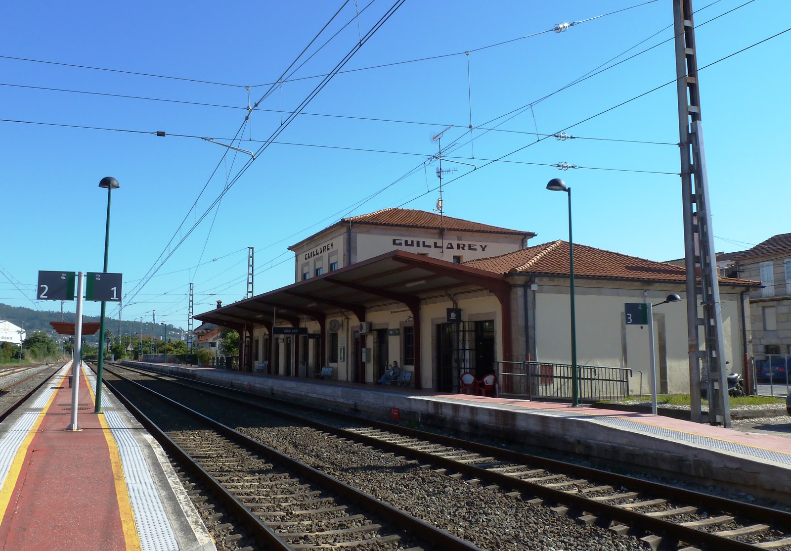 Mientras se tramitaba la construcción del puente internacional, en España se convocó el oportuno concurso para adjudicar la concesión del trayecto ferroviario entre Guillarey y Tuy, sección que fue otorgada, el 16 de agosto de 1880, a Ramón Aranaz y Luis Rouviere. Éstos, a su vez, traspasaron la concesión a la Compañía de los ferrocarriles de Medina a Zamora y de Orense a Vigo el 7 de diciembre del mismo año. Pese a la escasa longitud de este pequeño ramal, de poco más de 5 kilómetros, no se cumplieron los plazos previstos para la realización de las obras y el 15 de junio de 1882 el Gobierno autorizó una primera prórroga de cinco meses. Finalmente, los trabajos concluyeron en octubre de 1883, pero no se procedió a la inmediata puesta en servicio del tramo ya que «la apertura al tránsito público no era de gran interés hasta la del puente internacional».