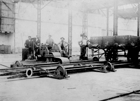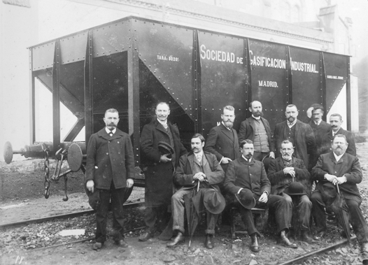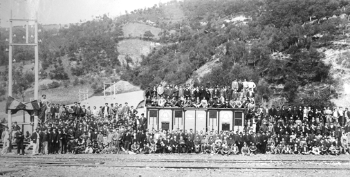 En 1907, la plantilla de la fábrica de vagones celebró la construcción del nº 1.000 de su producción. Fotografía de Pablo Weeber. Archivo EuskoTren/Museo Vasco del Ferrocarril
