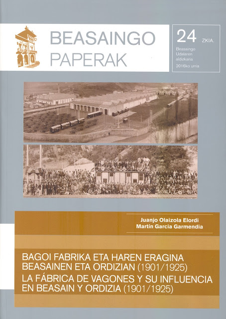 El pasado 25 de octubre se presentó en la torre de Igartza (Beasain), el Nº 24 de la colección Beasaingo Paperak. En esta ocasión, y como bien señala el título del nuevo volumen, “La fábrica de vagones y su influencia en Beasain y Ordizia (1901-1925)” el trabajo, obra de los historiadores Juanjo Olaizola Elordi y Martín García Garmendia, estudia la historia de la fábrica de vagones que estableció en 1905 la Sociedad Española de Construcciones Metálicas en Beasain y las repercusiones que esta importante industria tuvo sobre las poblaciones del entorno más inmediato, sobre todo Beasain y Ordizia, pero también, en otras como la vecina Lazkao.