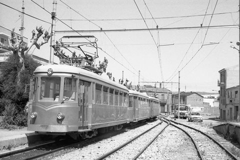 Una composición del "trenet" abandona la estación de Montcada. noviembre de 1982.Fotografía de Juanjo Olaizola Elordi