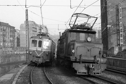 Unidad de la serie 300 de Renfe, originaria de la Compañía del Norte fotografiada en Bilbao-La Naja en agosto de 1983. Fotografía de Juanjo Olaizola Elordi