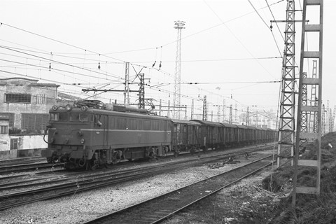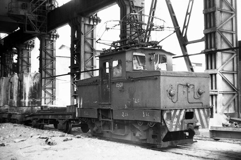 Las locomotoras Siemens de Altos Hornos del Mediterráneo podían circular mediante baterías en tramos no electrificados de la factoría. Mayo de 1984. Fotografía de Juanjo Olaizola Elordi