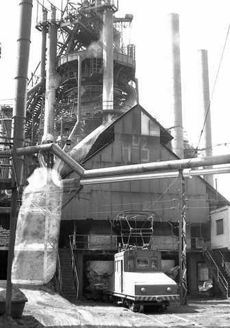 Locomotora de maniobras fotografiada bajo el alto horno Nº 3 de Sagunt (Valencia). mayo de 1984.Fotografía de Juanjo Olaizola Elordi