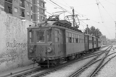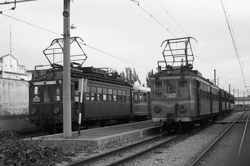 Dos clásicas composiciones del "trenet" de Valencia fotografiadas en la estación de Montcada. Noviembre de 1982. Fotografía de Juanjo Olaizola Elordi