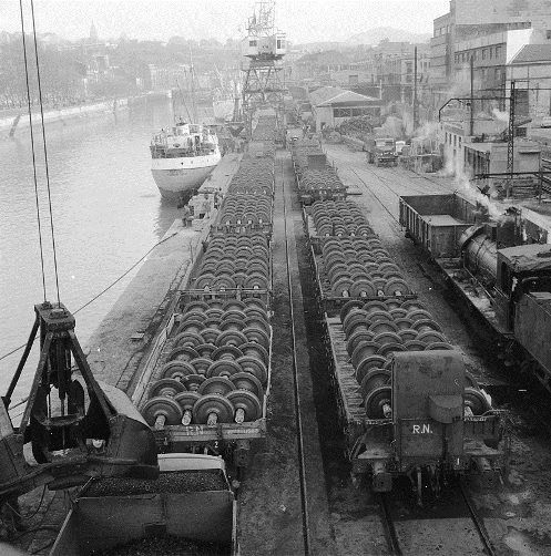 Exportación de ejes para los ferrocarriles de Thailandia, realizada en 1961. El punto de embarque es el muelle de Uribitarte, en Bilbao. Archivo EuskoTren/Museo Vasco del Ferrocarril