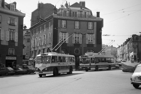 Trolebuses franceses de segunda y tercera generación fotografiados en Limoges en 1984. El primero de ellos contaba con cerca de cuarenta años de servicio en el momento en que se tomó la instantánea. Fotografía de Juanjo Olaizola Elordi