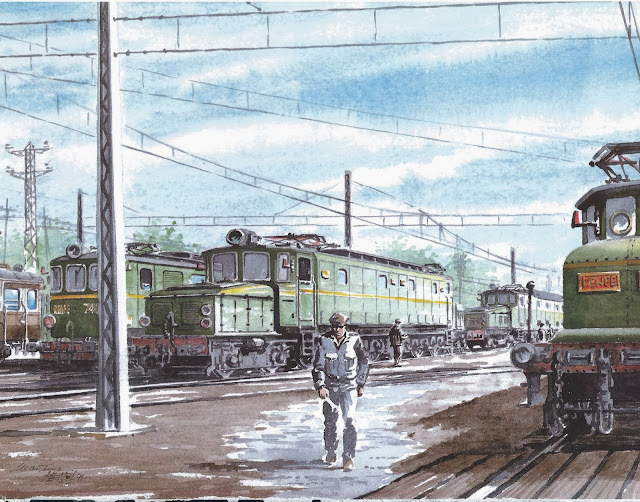 Para finalizar ,no me resisto a hacerlo sin incluir una magnífica acuarela del gran pintor de trenes Martinez Mendoza publicada en el libro "Imágenes del tren" en la que recrea el ambiente en el depósito de locomotoras de Príncipe Pío cuando las primeras "sietemiles" eran las reinas del depósito.