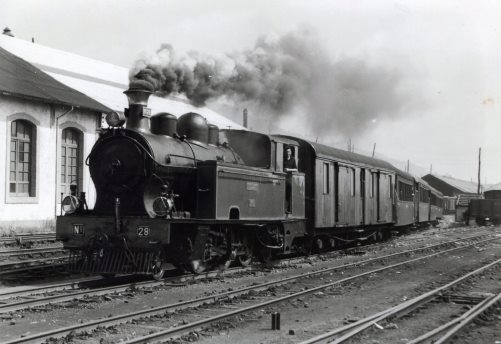 Salida de un tren de Económicos de Asturias, encabezado por la locomotora Nº 29, de la estación de Oviedo. Fotografía de Lawrence G. Marshall