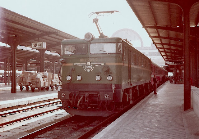 Ese mismo año, pero ya en octubre, fotografíé también en Chamartín por primera vez a una 269 de la serie 200 y ya con la decoración "Mazinger" en amarillo y azúl, para mí más fea que la verde de las 269.0 . Se trataba de la 269-214 del depósito de Can Tunís, construida por MACOSA, que con esta serie se introdujo en la construcción de estas locomotoras. Probablemente estaba dispuesta para remolcar el Talgo a Barcelona.