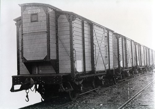 Nuevos vagones de mercancías, adquiridos para hacer frente al aumento del tráfico. Fondo Mariano de Corral. Archivo EuskoTren/Museo Vasco del Ferrocarril
