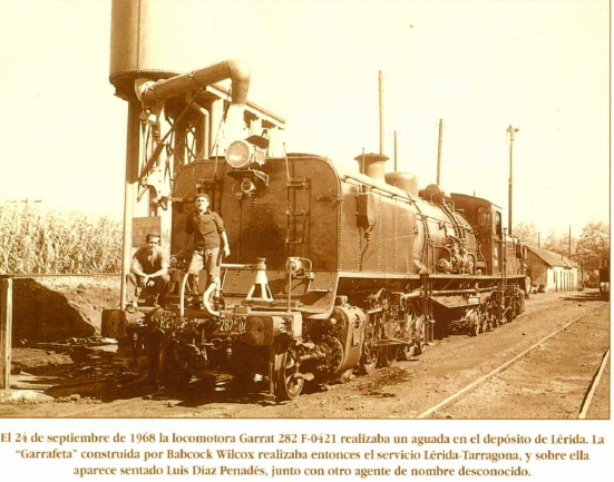 LA MAQUINA “Garrafeta” 282-0421 siempre se ha distinguido por su eficiencia y por el cuidado y la limpieza que le prestan el maquinista don Angel Marcano García y el fogonero don Luis Díaz Panadés. La foto está tomada desde el puente de Plana-Picamoixons, línea de I.érida-Reus-Tarragona, cuando remolcaba un tren regentado por el jefe de tren DomingoMadrid. (Nota y foto, cortesía suscriptor 40.618)