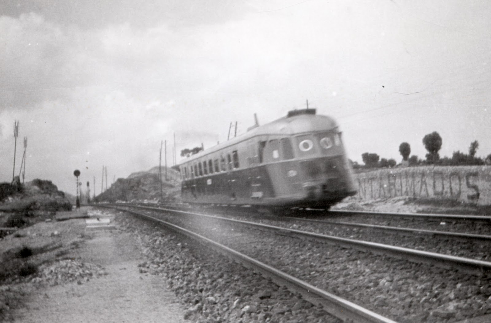 | Un fotógrafo desconocido obtuvo esta imagen de uno de los ABJ-2 del Norte en 25 de febrero de 1936. El automotor efectuaba pruebas entre Madrid y El Escorial y aquí aparece saliendo de la estación de Villalba (foto: Archivo Histórico Ferroviario del Museo del Ferrocarril de Madrid AHF/MFM) |