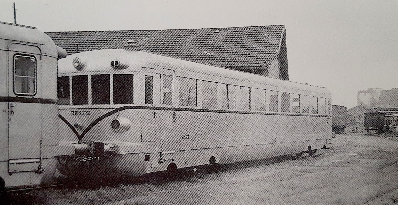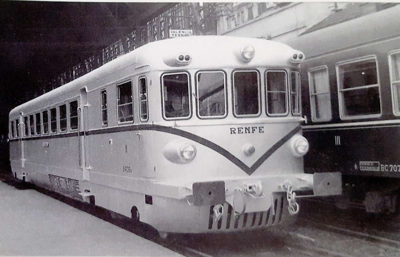 Uno de los Maybach, ahora ya reformado, en Valencia. Tras él parece adivinarse uno de los antiguos automotores del Central de Aragón (Foto: autor desconocido/ a través de Javier Aranguren)
