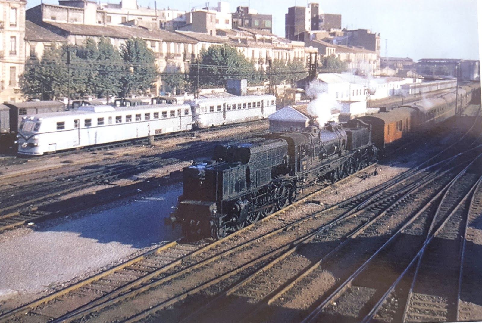 | Una típica imagen ferroviaria valenciana en los años 60. Una "Pacific Garrat" a la cabeza de un tren probablemente hacia Tarragona y Barcelona. Al fondo dos automotores: un "Ganz grande" y uno de los Maybach. En su testero puede verse aunque con dificultad el añadido sobre el frontal que debía estar relacionado con la comunicación directa entre automotor y remolque. Al fondo varias composiciones de ferrobuses (foto: AHF) |
