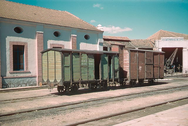 | Un vagón de carga general y otro jaula en la estación de Villena en 1961. En general todo el material móvil llevaba ruedas de radios (foto: Ch. Firminger) |