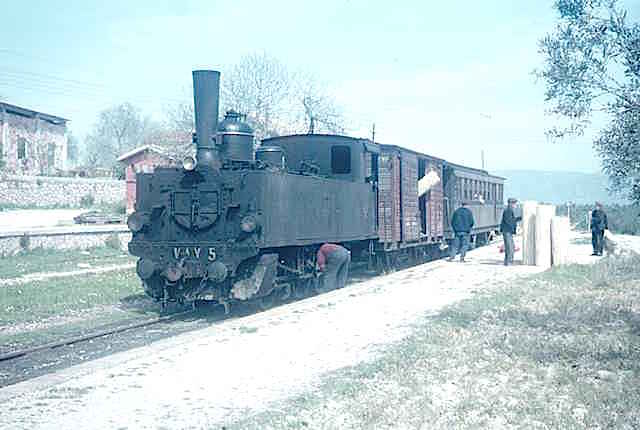 | La VAY nº 5 en Villena en cabeza de un tren de mercancías (foto: L. G. Marshall) |