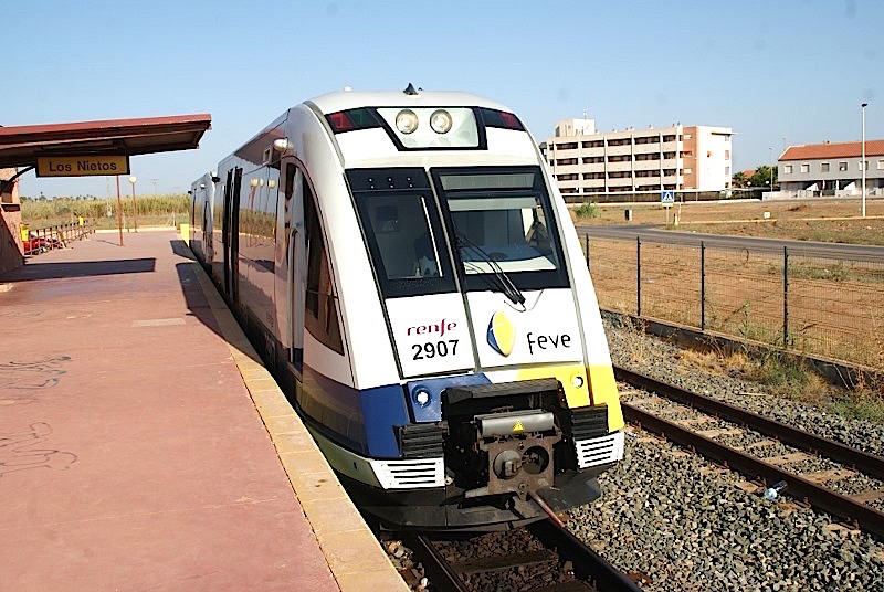 El 1 de enero de 1965, FEVE sustituyó a EFE en la explotación y clausuró definitivamente el servicio de mercancías. En 1972 llevó a cabo la necesaria transformación del ancho de vía a un metro, para equipararla al resto de su red. Asumió también la ya proyectada ampliación hasta Los Nietos, donde llegó en 1976. FEVE, ahora RENFE-FEVE, ha continuado con su explotación hasta el momento actual, sin que me deje de sorprender que ocurra así, al encontrarse en un zona aislada y alejada del resto de sus líneas. Y supongo, aunque puedo equivocarme- que lo hace ante la falta de interés de la Comunidad Murciana de asumirla, aún siendo un servicio de marcado interés social.