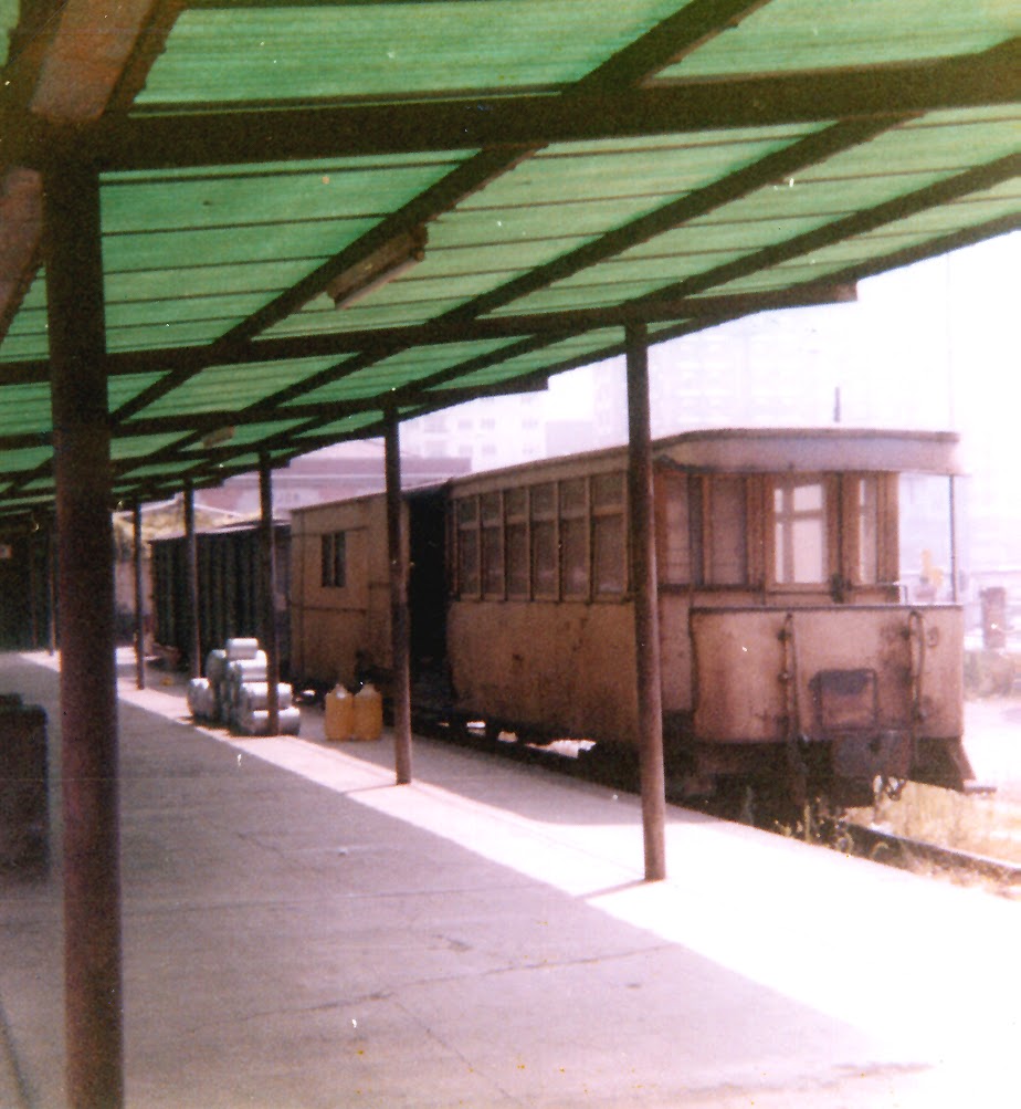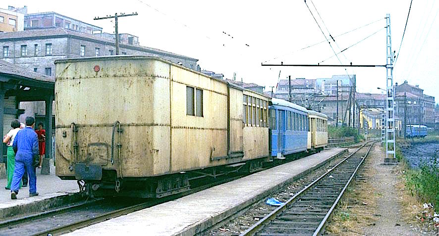 | Aunque con mucha menor calidad, también pude fotografiar a este curioso remolque mixto en la estación de FEVE de Gijón en la misma época que la anterior (foto: Ángel Rivera) |