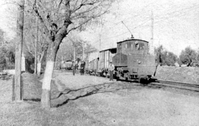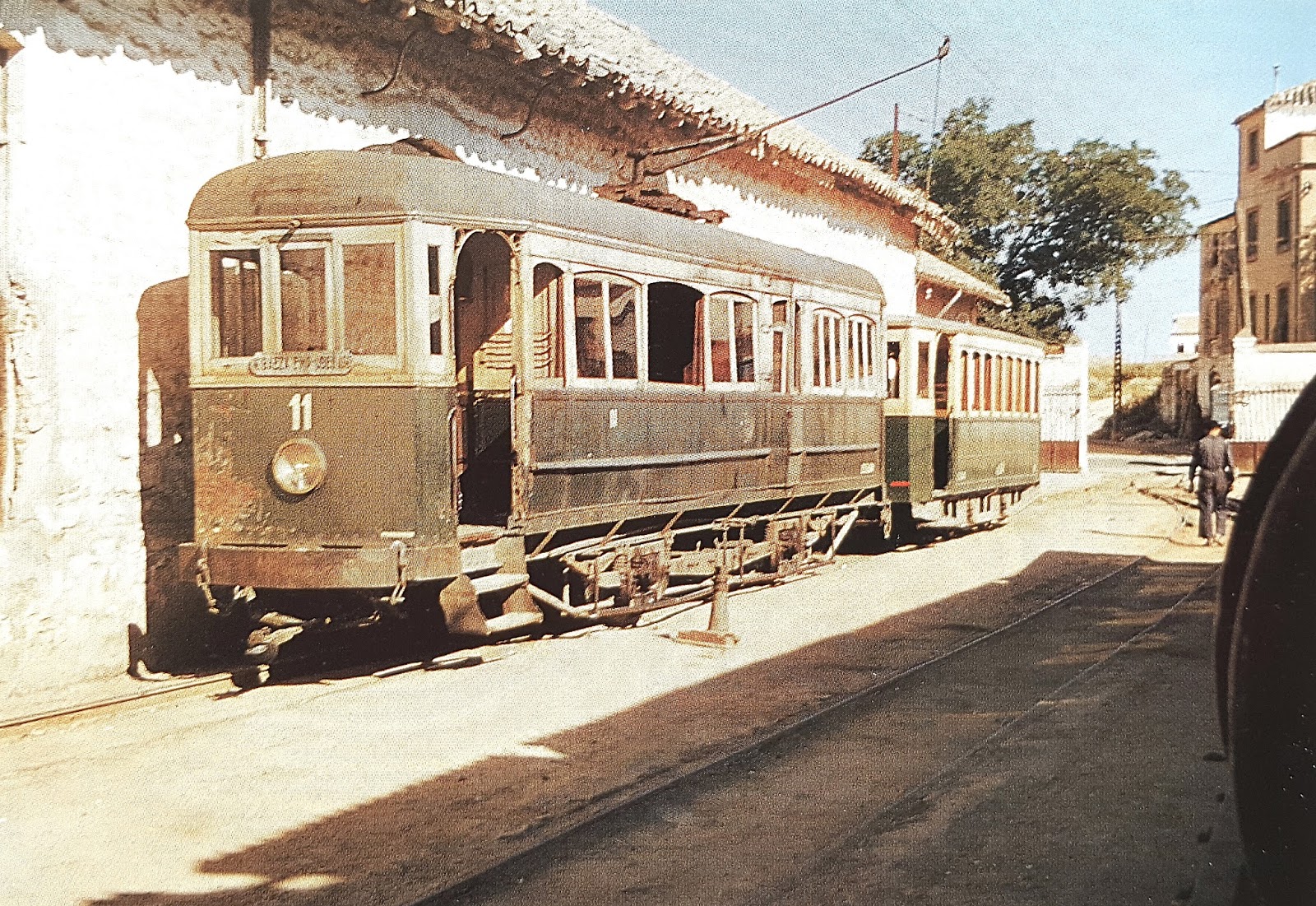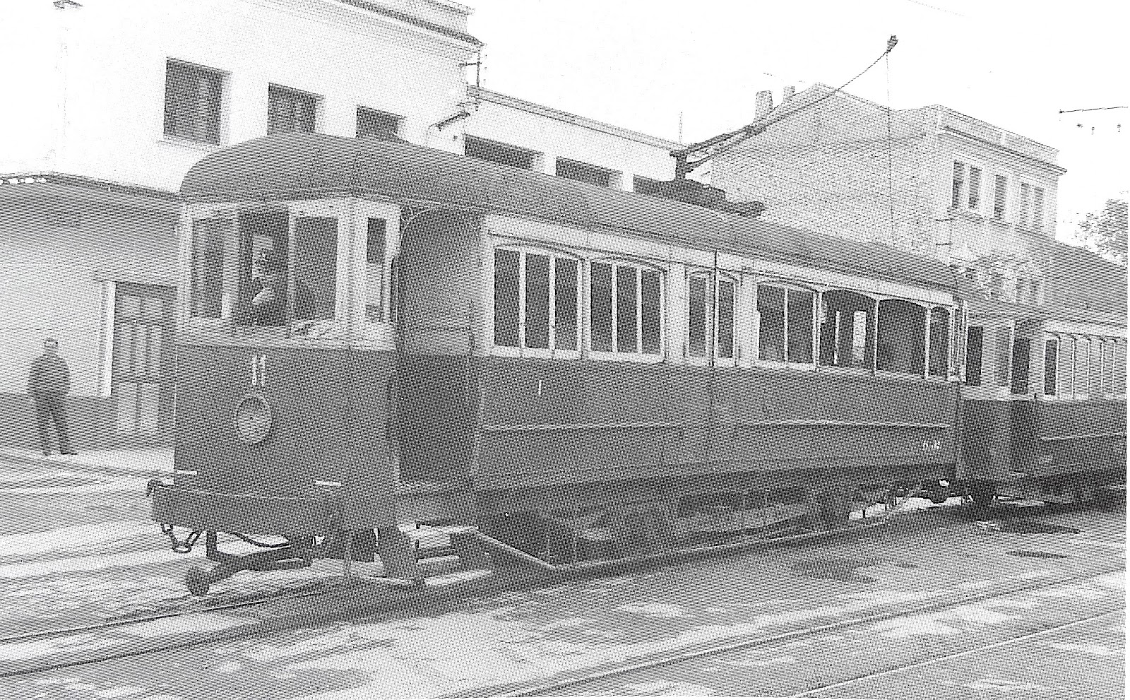 | El M-7 de T.L. (Tranvías de Linares) con un remolque no identificado en 1961 (foto: J. Aranguren) |